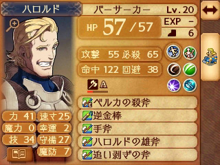 実際の攻撃力は先手必勝+斧得意で画面数値よりも+9。必殺の値も65以上になること多し。